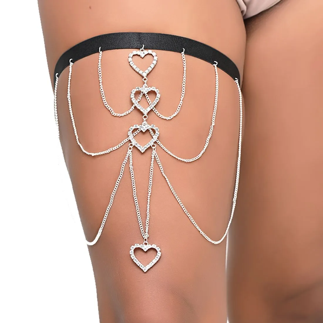 Feito para envolver a parte superior da perna com sensualidade, ele combina correntes com corações de strass que capturam o olhar e direcionam a atenção para a coxa, uma região que, com esse toque de brilho, ganha destaque absoluto.